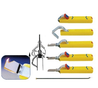 刀头钛涂层。切割深度可精确设定。耐磨塑料手柄。010-⋯020:可以纵向、麻花螺旋方向割开绝缘皮。手柄有备用割刀。没有预割刀片。⋯030-⋯060:可以剥开常用电缆。手柄有备用割刀。没有预割刀片。