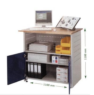 尺寸: 宽 1100×深 800×高 1100 mm。 实心操作面 宽 1100×深 800×高 25 mm 带漆表面, 圆形边角。 稳定和扭转自由钢板结构。 开放式货架, 高 370 mm ,柜体后部可接电源线及有线电视线。 底柜为双叶门(可上锁) 分为两个储物空间 (170 和 330 mm)。 可选固定式(通过底座可水平调整) 或者移动式(有2个固定脚轮和2个旋转脚轮)。 柜体: RAL 7035 浅灰, 门: RAL 5010龙胆蓝。 柜体: RAL 7016 煤灰色, 前面板 RAL 5012