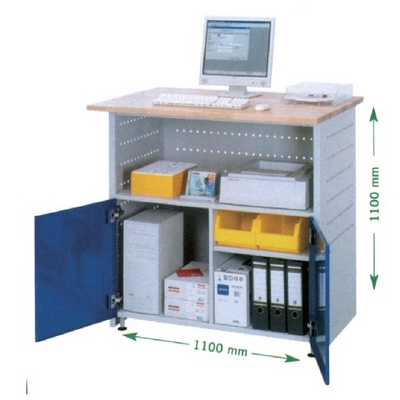 尺寸: 宽 1100×深 800×高 1100 mm。 实心操作面 宽 1100×深 800×高 25 mm 带漆表面, 圆形边角。 稳定和扭转自由钢板结构。 开放式货架, 高 370 mm ,柜体后部可接电源线及有线电视线。 底柜为双叶门(可上锁) 分为两个储物空间 (170 和 330 mm)。 可选固定式(通过底座可水平调整) 或者移动式(有2个固定脚轮和2个旋转脚轮)。 柜体: RAL 7035 浅灰, 门: RAL 5010龙胆蓝。 柜体: RAL 7016 煤灰色, 前面板 RAL 5012