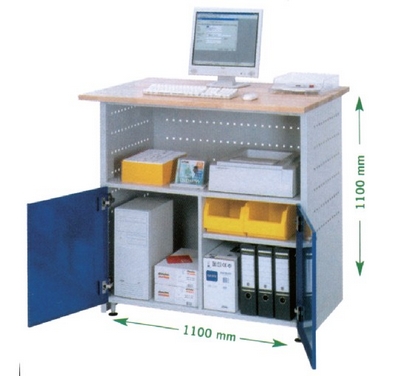 尺寸: 宽 1100×深 800×高 1100 mm。 实心操作面 宽 1100×深 800×高 25 mm 带漆表面, 圆形边角。 稳定和扭转自由钢板结构。 开放式货架, 高 370 mm ,柜体后部可接电源线及有线电视线。 底柜为双叶门(可上锁) 分为两个储物空间 (170 和 330 mm)。 可选固定式(通过底座可水平调整) 或者移动式(有2个固定脚轮和2个旋转脚轮)。 柜体: RAL 7035 浅灰, 门: RAL 5010龙胆蓝。 柜体:RAL 7016 煤灰色, 前面板 RAL 5012 浅