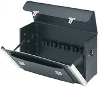 箱体两侧和底部采用双层防撞和防潮的高强度聚乙烯材料;箱体前后和翻盖部分采用黑色小牛皮材料;舒适方便的耐磨皮革箱包前层设有口袋,皮带和搭扣环可调换;箱体前面部分用铝合金加固;内部尺寸为(WxHxD) 420X250X160 mm;货号 00 21 02 LE:工具箱(空)