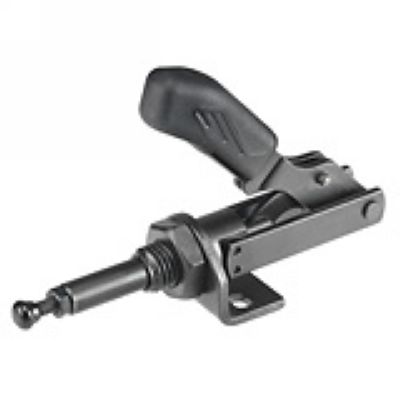 with small angle base. For push- and pull-clamping. (Equal operation of rod and lever). Long rod-guide with attaching thread and nut. Matte-black galvanized. Rivets made of stainless steel. Lever-parts and rod of tempered steel. Bearings are pre-lubricate